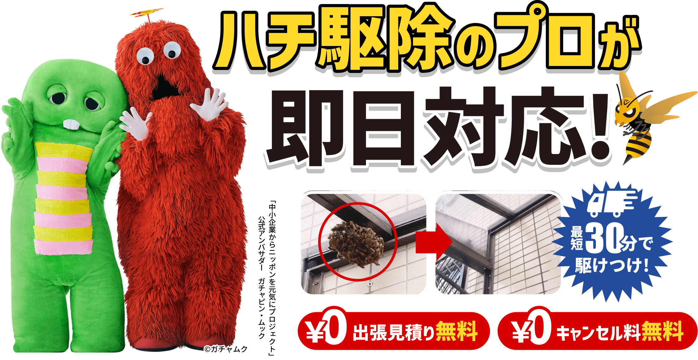 - 最短30分でハチ駆除のプロが駆けつけます!