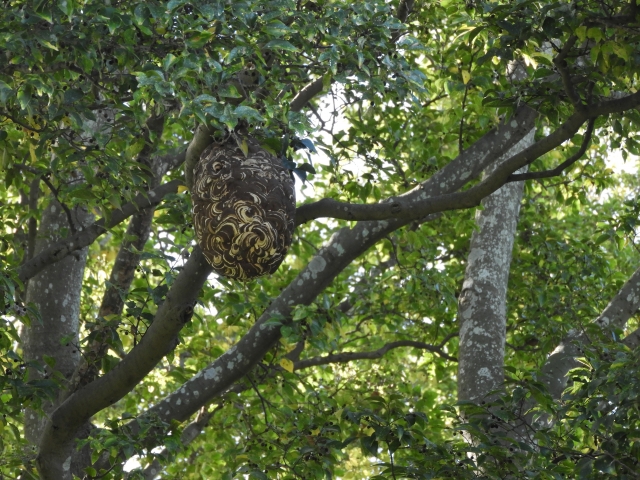 小ぶりな巣(ゴルフボール大~10cm程度)で働きバチの数が少ない初期段階なら自力駆除も可能ですが、大きく成長した巣は手を出さない方が賢明です。